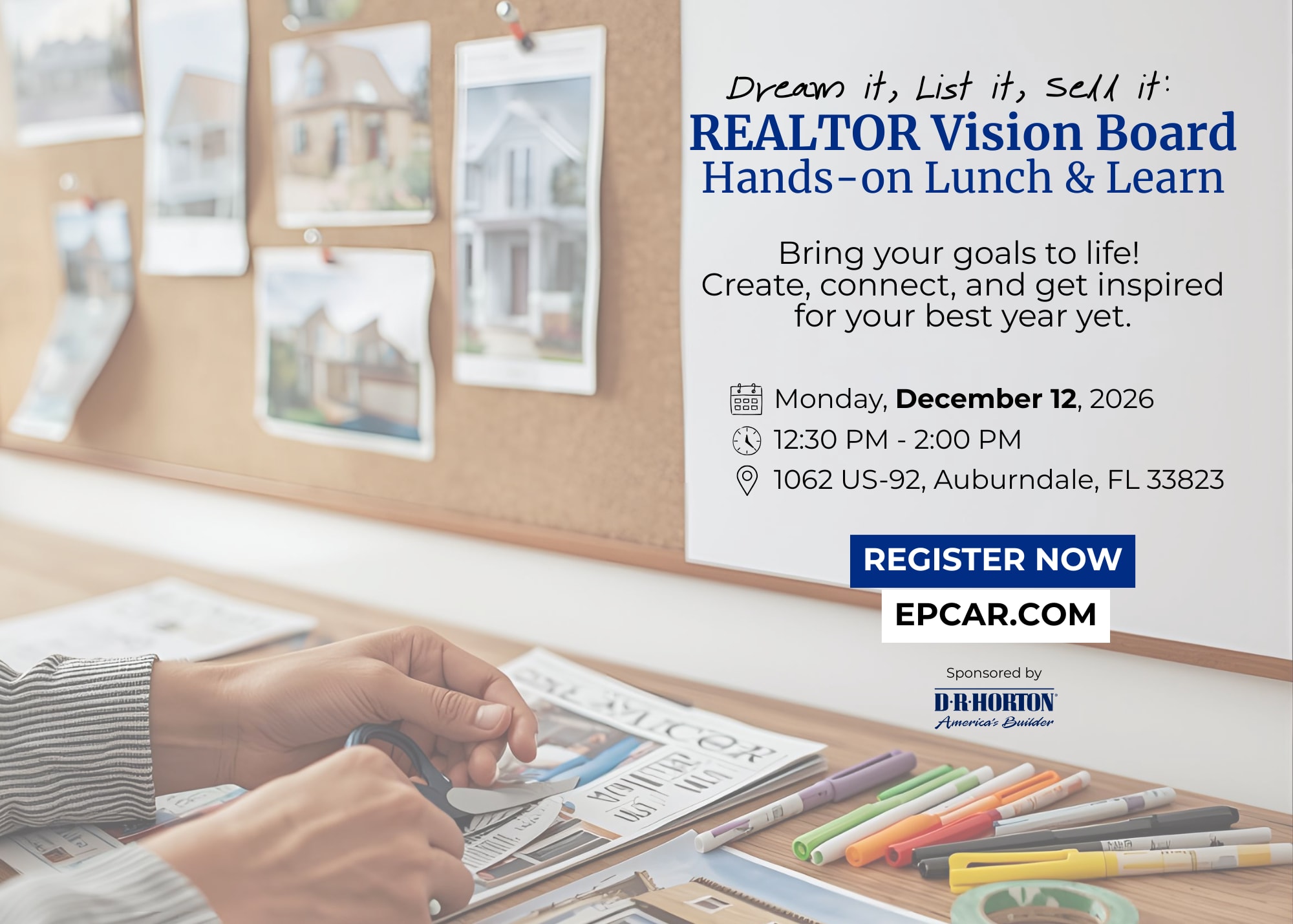 Kick off 2026 with clarity, confidence, and intention. Join us for a hands-on Lunch & Learn where you'll create a personalized REALTOR vision board to inspire your goals, strengthen your mindset, and keep your business moving forward all year long. All supplies and lunch included, just bring your vision.