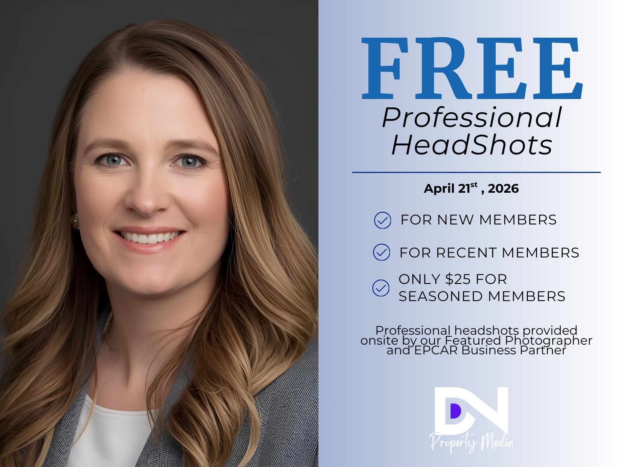 A polished, professional headshot is one of the most important tools for your real estate career. It's often the first impression potential clients and colleagues will have of you - on the MLS, your business cards, and across all marketing platforms. Offered at EPCAR New Member Orientation Free for New Members (Orientation attendees) $25 for existing REALTORS who would like to update their image. Don't miss the chance to refresh your professional look with a high- quality portrait that reflects your brand. For members not attending orientation - photos are scheduled for 1:00 pm to 2:00 pm Register Now Spaces are Limited ****