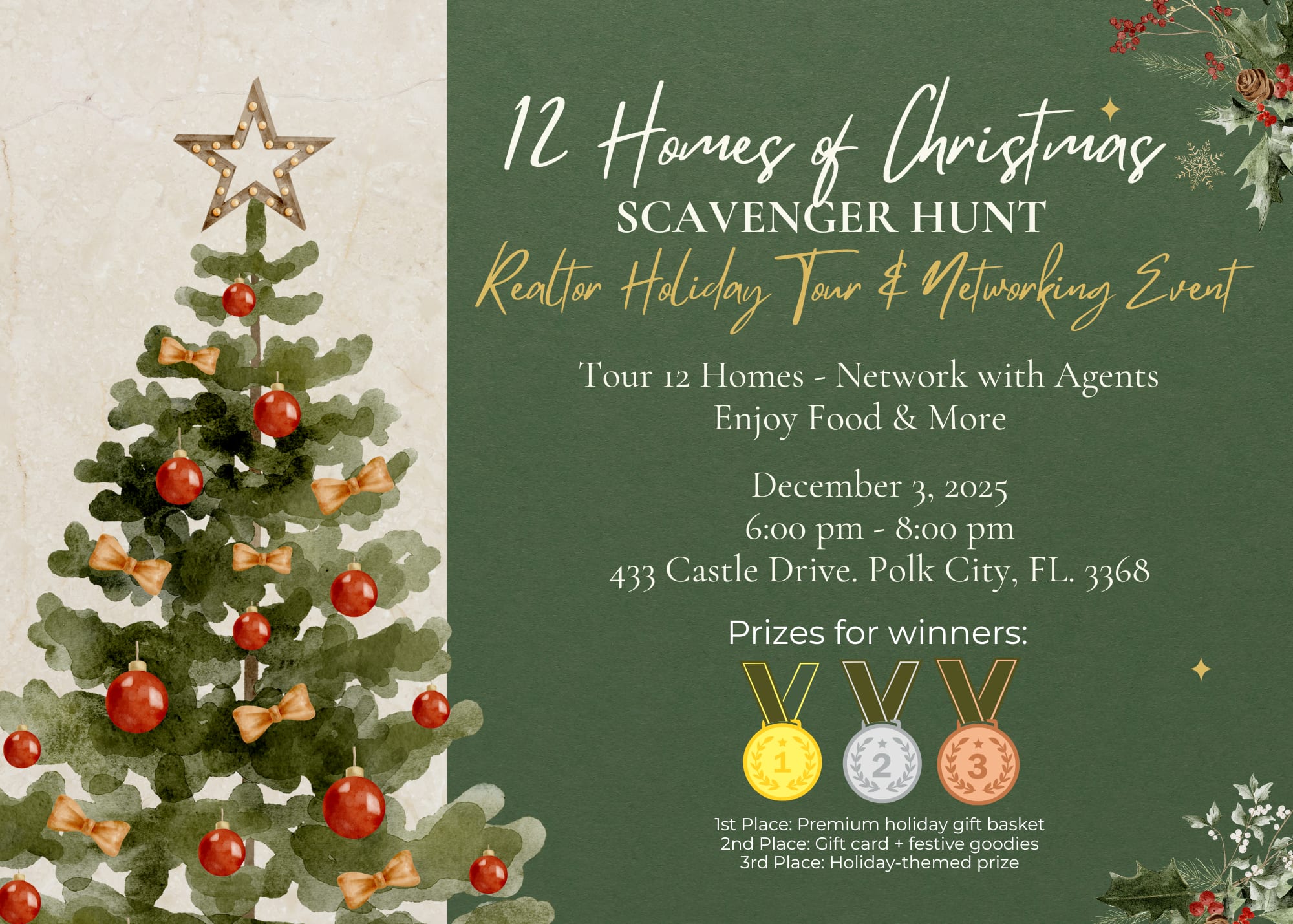 Join us for as festive evening of fun, networking, and holiday spirit! Inspired by The 12 Days of Christmas, this Realtor Scavenger Hunt invites you to tour 12 beautifully decorated homes, each featuring its own holiday theme and challenge. Collect clues, earn points, and see if you can take home one of our top prizes!