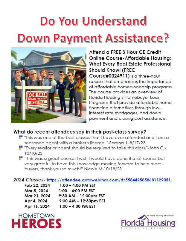 “Affordable Housing Solutions: What Every Real Estate Professional Should Know!” is a three-hour course that emphasizes the importance of affordable homeownership programs. The course provides an overview of Florida Housing’s Homebuyer Loan Programs that provide affordable home financing alternatives through low-interest rate mortgages, and down payment and closing cost assistance.