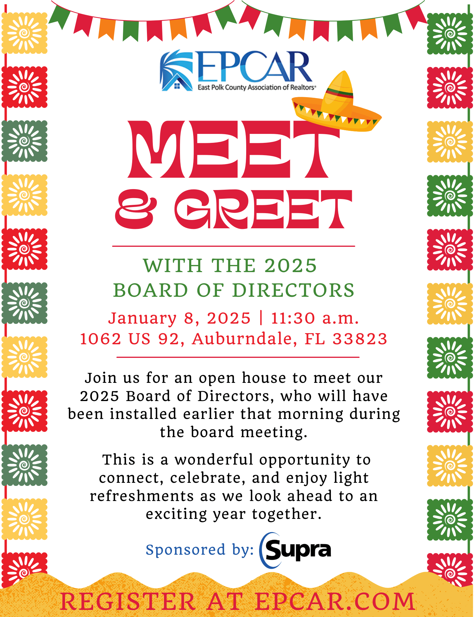 EPCAR is hosting a meet and greet with the 2025 Board of directors. Join us for an open house to meet our 2025 Board of Directors, who will have been installed earlier that morning during the board meeting. This is a wonderful opportunity to connect, celebrate, and enjoy light refreshments as we look ahead to an exciting year together!