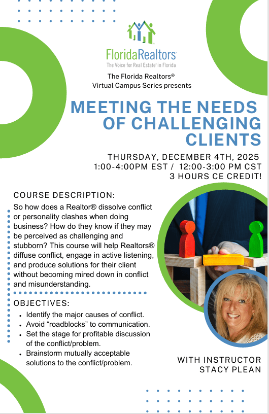So how does a Realtor® dissolve conflict or personality clashes when doing business? How do they know if they may be perceived as challenging and stubborn? This course will help Realtors® diffuse conflict, engage in active listening, and produce solutions for their client without becoming mired down in conflict and misunderstanding.
