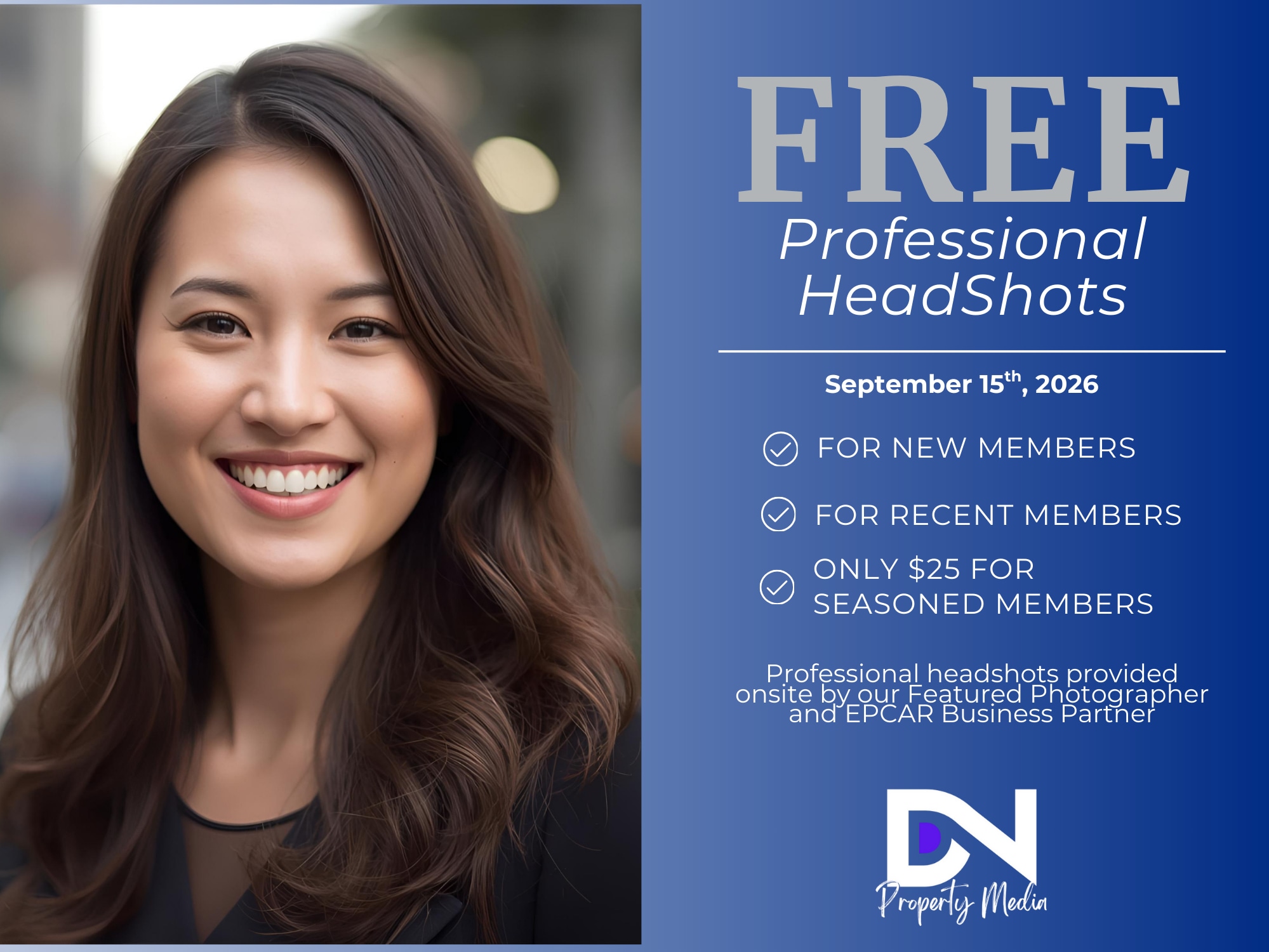 A polished, professional headshot is one of the most important tools for your real estate career. It's often the first impression potential clients and colleagues will have of you - on the MLS, your business cards, and across all marketing platforms. Offered at EPCAR New Member Orientation Free for New Members (Orientation attendees) $25 for existing REALTORS who would like to update their image. Don't miss the chance to refresh your professional look with a high- quality portrait that reflects your brand. For members not attending orientation - photos are scheduled for 1:00 pm to 2:00 pm Register Now Spaces are Limited ****