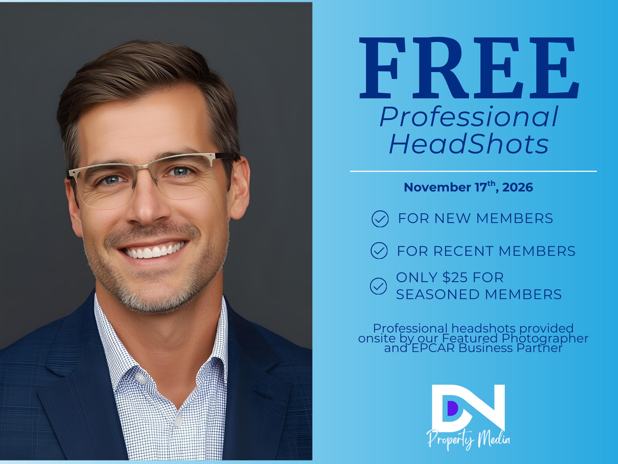 A polished, professional headshot is one of the most important tools for your real estate career. It's often the first impression potential clients and colleagues will have of you - on the MLS, your business cards, and across all marketing platforms. Offered at EPCAR New Member Orientation Free for New Members (Orientation attendees) $25 for existing REALTORS who would like to update their image. Don't miss the chance to refresh your professional look with a high- quality portrait that reflects your brand. For members not attending orientation - photos are scheduled for 1:00 pm to 2:00 pm Register Now Spaces are Limited ****Images