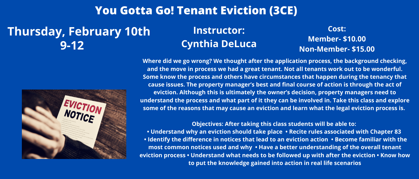 Where did we go wrong? We thought after the application process, the background checking, and the move in process we had a great tenant. Not all tenants work out to be wonderful. Some know the process and others have circumstances that happen during the tenancy that cause issues. The property manager’s best and final course of action is through the act of eviction. Although this is ultimately the owner’s decision, property managers need to understand the process and what part of it they can be involved in. Take this class and explore some of the reasons that may cause an eviction and learn what the legal eviction process is.
